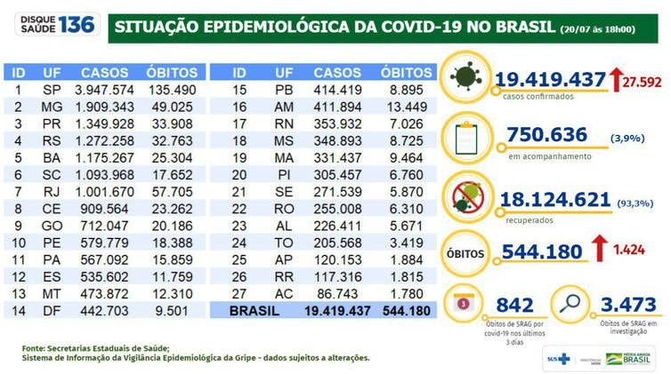 O Brasil registrou, nesta terça-feira, 20/7, o total de 544.180 vidas perdidas em decorrência da covid-24. Em 24 horas, as autoridades de saúde notificaram 1.424 mortes.