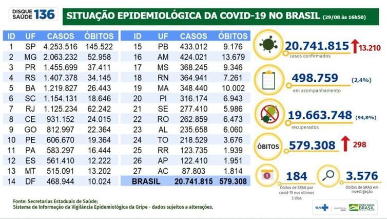 O Ministério da Saúde divulgou hoje, 29/8, novos números sobre a pandemia de covid-19 no país. De acordo com levantamento diário feito pela pasta, o Brasil tem, desde o início da pandemia, 20,7 milhões de casos confirmados da doença e 579,3 mil mortes registradas. O número de recuperados soma 19,6 milhões.