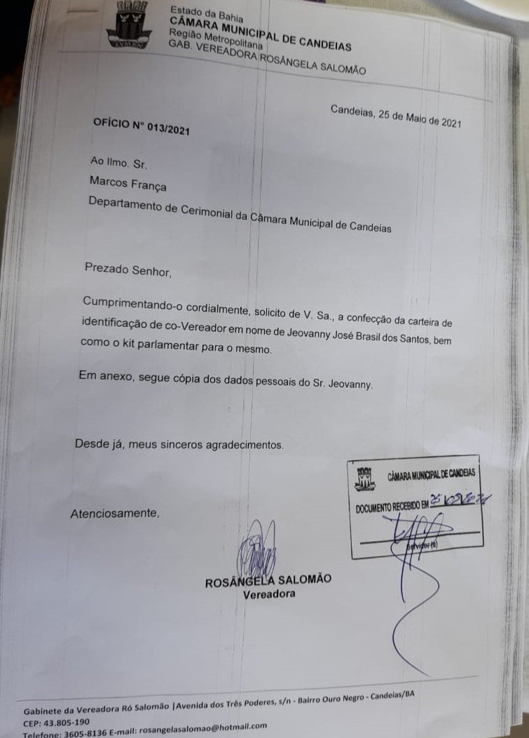Um ofício (cópia abaixo) encaminhado pela vereadora Ró Salomão (Podemos) à Presidência da Câmara Municipal de Candeias, na Região Metropolitana a 46 km de Salvador, causa perplexidade no legislativo municipal e na classe política da cidade.
