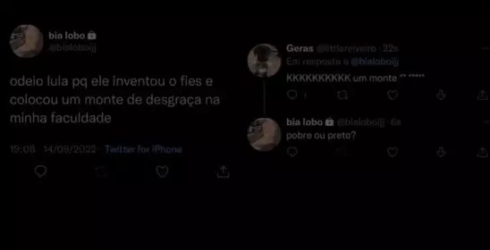 “Odeio Lula porque ele inventou o Fies e colocou um monte de desgraça na minha faculdade”. Em seguida, um seguidor respondeu a publicação: “KKKKKKKKK um monte ** *****”, e a aluna rebateu com a seguinte pergunta: “pobre ou preto?”.