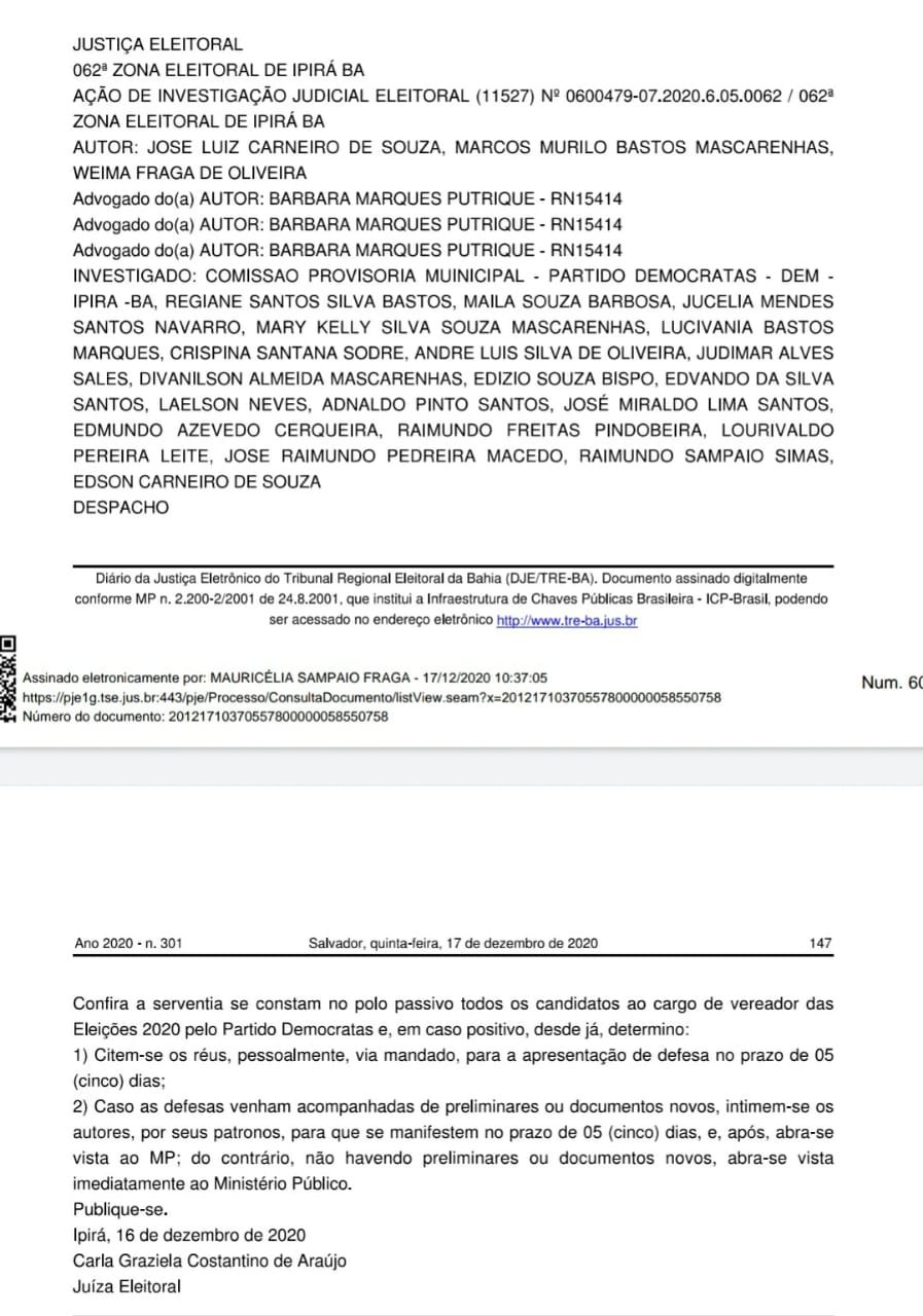 Um dos integrantes do DEM na cidade de Ipirá disse, por meio de redes sociais que a notícia do MP publicada no Bahia On e no Tudo News, era inverídica já que estava transitado em julgado. Isso somente ocorreria se a ação tivesse sido analisada pelo TSE (Tribunal Superior Eleitoral) já sem possibilidade de recurso, não na 1ª nem na 2ª instância, a não ser que ninguém (nem mesmo o MP) tenha recorrido. Na 1ª e 2ª instância sempre há possibilidade de recurso.