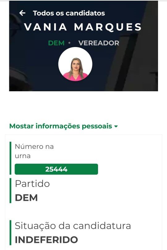 Contudo, uma das candidatas, a funcionária pública Vânia Marques, teve o registro indeferido por não cumprir o prazo de desincompatibilização. Como a candidatada não foi substituída no prazo legal e nem sequer houve defesa, restaram, então 5 mulheres aptas, o que corresponde a 26,5% do total de inscritos pelo partido, o que pela lei exclui o DEM do pleito. Isso obrigaria a substituição por outra mulher ou exclusão de 3 nomes masculinos, o que também não ocorreu.