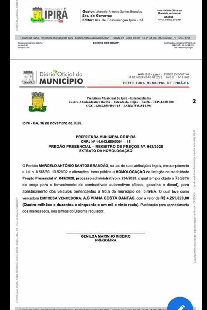 A terça-feira, 17/11, 48h depois de nocauteado e estar na lona, foi de mais duro golpe nas finanças da administração de Ipirá. A 44 dias de deixar o cargo, Malamanhado homologou um contrato com a empresa AS Viana Costa Dantas de R$ 4.251.020,00 (quatro milhões, duzentos e cinquenta e um mil e vinte reais) para fornecimento de etanol, gasolina e diesel para a frota da cidade.