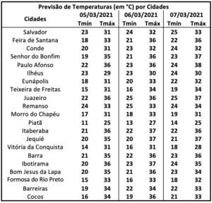 Neste sábado, 6/3, o tempo e a temperatura devem se manter a condição de sexta-feira, ou seja, tempo firme ao longo de todas as regiões do estado da Bahia, com pouca nebulosidade, baixa umidade relativa nas regiões centrais e altas temperaturas. Regiões litorâneas deverão ter uma maior cobertura de nuvens, devido a alta disponibilidade de umidade oceânica.