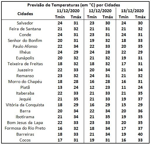 Segundo o Inema (Instituto do Meio Ambiente e Recursos Hídricos da Bahia) neste sábado, 12/12, o dia deverá ter variação de nebulosidade e chuva periódica de fraca intensidade nas regiões pertencentes à faixa Centro-Sul do estado baiano. No setor Norte do estado, o centro de um vórtice ciclônico de altos níveis, vai inibir a formação de nebulosidade e vai manter a umidade relativa baixa devido a um ramo descendente de ventos no seu interior. Ao longo do Litoral, uma zona de alta pressão em níveis médios manterá o dia com variação de nebulosidade e pequenas chances de ocorrer de pancadas de chuvas isoladas ao longo do dia.