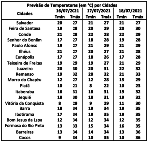 Segundo o Inema (Instituto de Meio Ambiente de Recursos Hídricos da Bahia), a tendência para este sábado, 17/7, é de tempo firme em todas as regiões do estado da Bahia, com pouca nebulosidade, baixa umidade relativa nas regiões do centro-oeste, assim como, altas temperaturas. Regiões litorâneas deverão ter uma maior cobertura de nuvens, devido a alta disponibilidade de umidade oceânica, mas apenas com pequenas chances de chuvas isoladas no litoral Nordeste.
