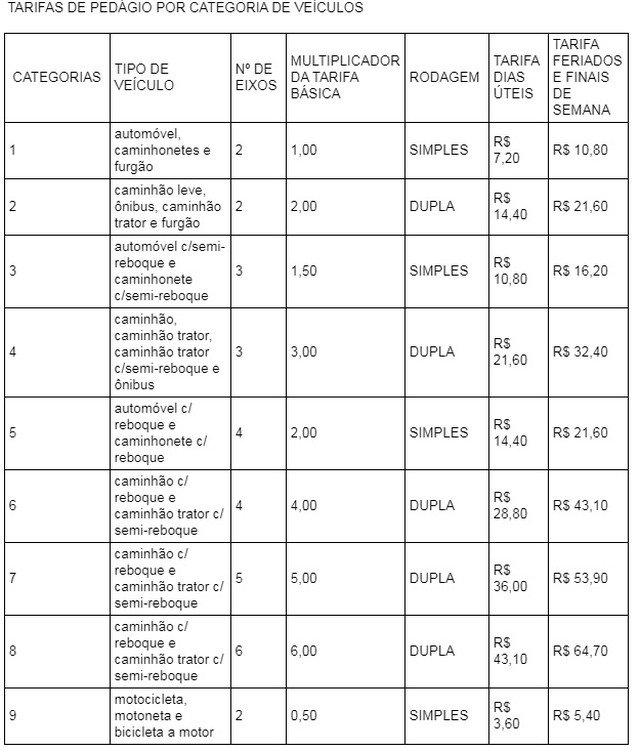 A rodovia é administrada pela CLN (Concessionária Litoral Norte), e a mudança de valores, informou a Agerba, foi readequada com base no IPCA (Índice Nacional de Preços ao Consumidor Amplo) para cada categoria de veículo.